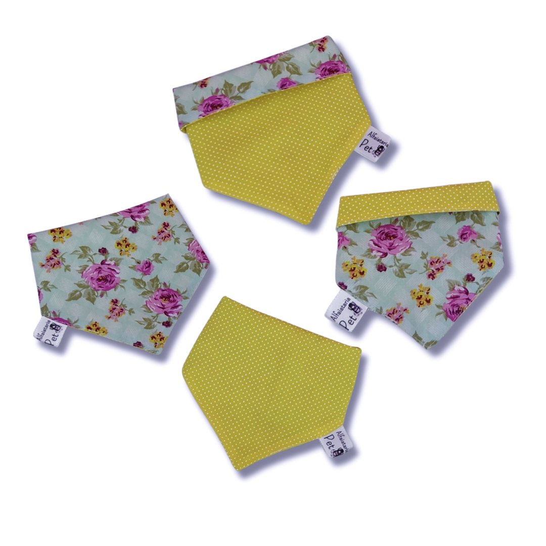 Bandana dupla face, com estampa floral de um lado e amarelo com bolinhas do outro. Duas opções de visual em uma única peça, do delicado ao divertido.