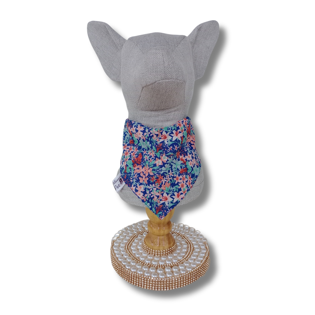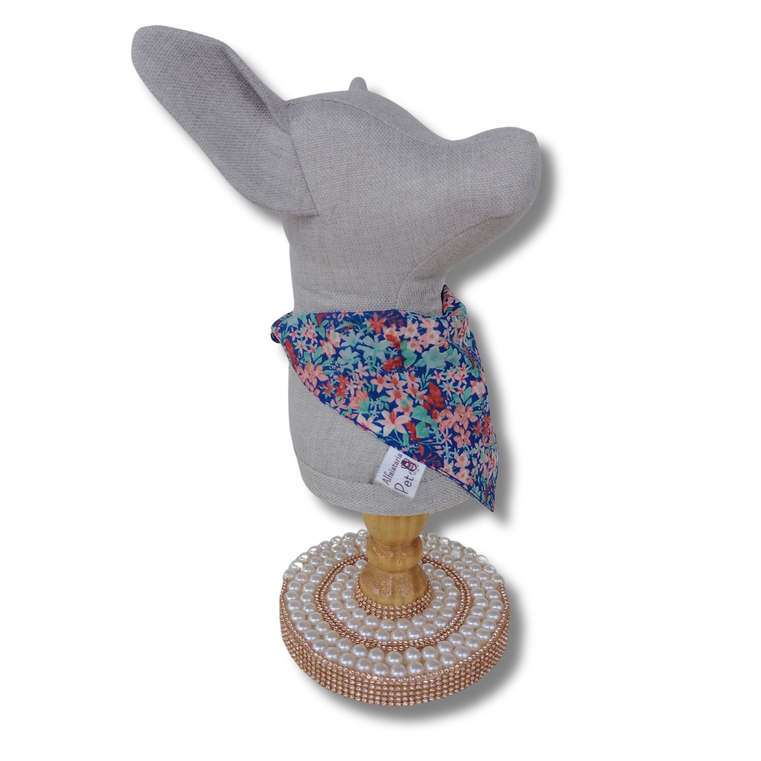 É dupla face, feita à mão em tricoline 100% algodão, leve e antialérgica. De um lado, azul liso e do outro, estampa floral delicada. Possui botões de pressão com 3 ajustes no pescoço e permite até 4 formas diferentes de uso. Conforto, estilo e praticidade para o dia a dia do seu pet 🐾✨